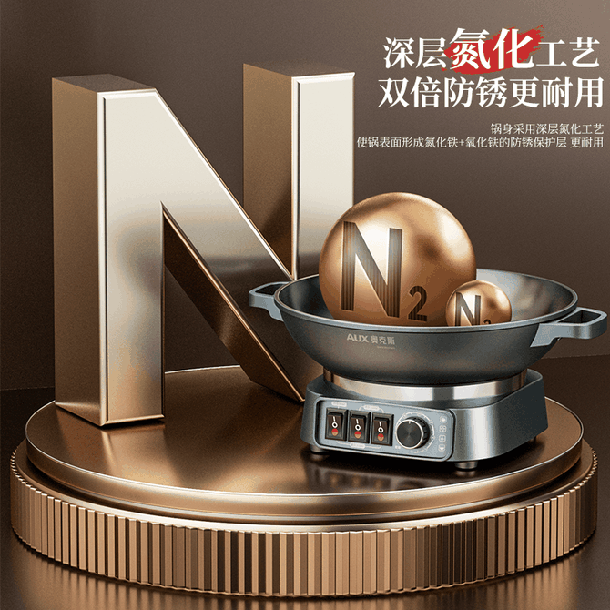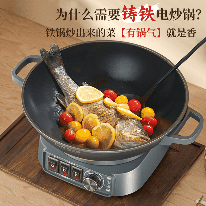奥克斯 电炒锅无涂层物理不粘锅一体插电多功能铁锅家用电煮锅电蒸锅炖蒸煮铸铁电热锅炒菜专用大容量电锅定时款34CM双笼 5.5L
