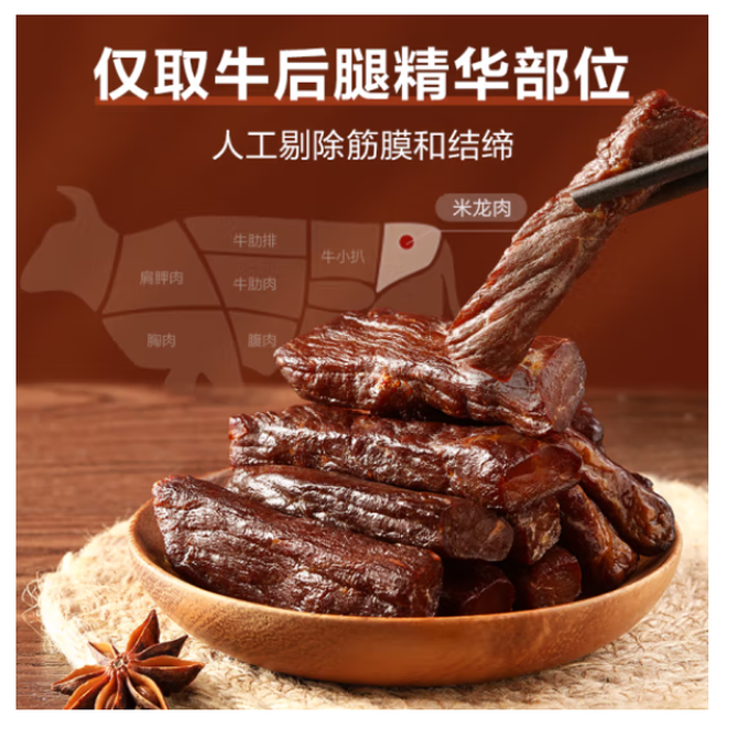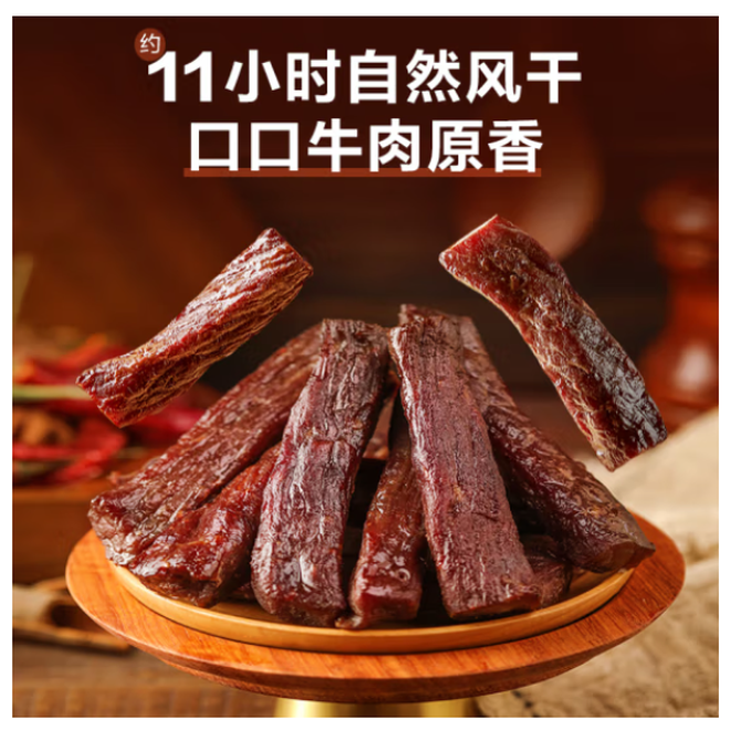 组合销售 产品介绍 产品规格 售后服务 产品咨询 发现好货 蒙都 风干牛肉干 500g (原味/五香/孜然/香辣)下单备注口味 新老包装随机 7000 里程 蒙都 酱牛肉200g*2袋 卤牛肉 熟食 内蒙古特产 五香真空包装熟牛肉 4100 里程 百草味 白芝麻猪肉脯100g 休闲零食肉干肉脯 1100 里程 百草味 原切牛肉片50g*1袋 牛肉干休闲零食 特产小吃肉干 1500 里程 三只松鼠(Three Squirrels) 蜀香牛肉麻辣味肉脯即食卤味牛肉 100gx2袋 1300 里程