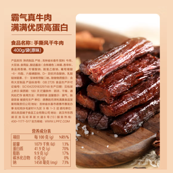 良品铺子 手撕风干牛肉七成干400g(原味)牛肉干内蒙风味休闲零食量贩装 (新老包装随机发货)七成干400g(原味) 兑换价格 10800 里程 会员卡别 终身白金卡 白金卡 金卡 银卡 普通卡 儿童卡 服务 由 美味思食品店 发货并提供售后 规格: 袋装 购买数量: 件 库存件 配送地址: 立即购买 加入购物车 成功添加到购物车 关闭 购物车共有 种商品 总金额为: 组合销售 产品介绍 产品规格 售后服务 产品咨询 发现好货 蒙都 风干牛肉干 500g (原味/五香/孜然/香辣)下单备注口味 新老包装随机 7000 里程 蒙都 酱牛肉200g*2袋 卤牛肉 熟食 内蒙古特产 五香真空包装熟牛肉 4100 里程 百草味 白芝麻猪肉脯100g 休闲零食肉干肉脯 1100 里程 百草味 原切牛肉片50g*1袋 牛肉干休闲零食 特产小吃肉干 1500 里程 三只松鼠(Three Squirrels) 蜀香牛肉麻辣味肉脯即食卤味牛肉 100gx2袋 1300 里程
