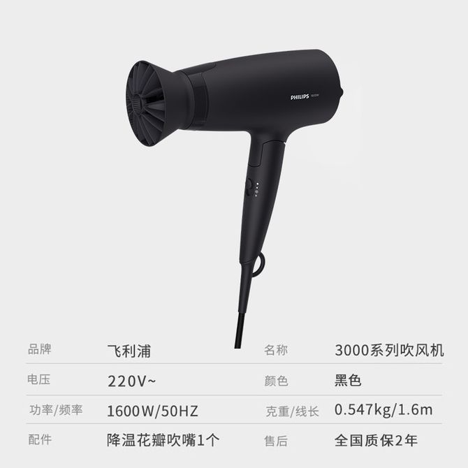 飞利浦/Philips 电吹风机 BHD308 小花筒吹风机 1600W家用大功率负离子吹风筒 恒温护发速干可折叠 黑色 降温花瓣风嘴,恒温护发,便携可折叠 如有购买使用咨询可电话联系客服17611538979 兑换价格 5200 里程 会员卡别 终身白金卡 白金卡 金卡 银卡 普通卡 儿童卡 服务 由 旭永家居电器专营店 发货并提供售后 颜色: 黑色 购买数量: 件 库存件 配送地址: 立即购买 加入购物车 成功添加到购物车 关闭 购物车共有 种商品 总金额为: 组合销售 产品介绍 产品规格 售后服务 产品咨询 发现好货 飞科/Flyco 高速电吹风机便携出游速干降噪负离子护发大风力吹风筒FH6370 4900 里程 徕芬 入门款高速吹风机 家用电吹风莱芬大风力速干低噪宿舍便携风筒 礼物推荐 国家补贴 SE lite 9000 里程 奥克斯/AUX 吹风机 家用负离子护发恒温护发电吹风AH7800 2400 里程 飞科/Flyco 高速电吹风机送女生节日礼物家用宿舍便携速干降噪负离子护发大风力吹风筒FH6370白 5000 里程 永日 蓝光新款可折叠便携式大风量速干负离子电吹风 YR-6228 4700 里程