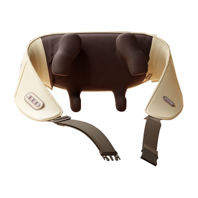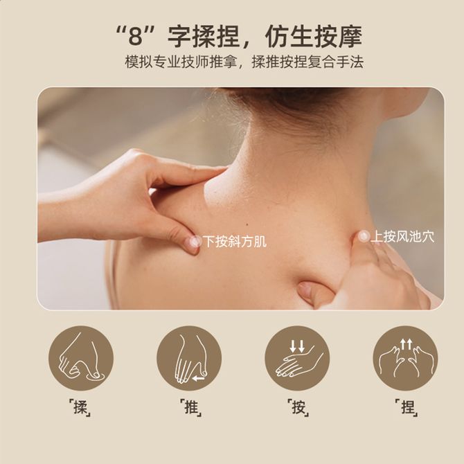 1.无线便携,肩带式使用 2.仿人手8字型揉捏,舒缓肩颈不适 3.两档温感热敷,促进血液循环 4.内置锂电池,type-c充电接口 5.双模式双力度选择,满足不同需求