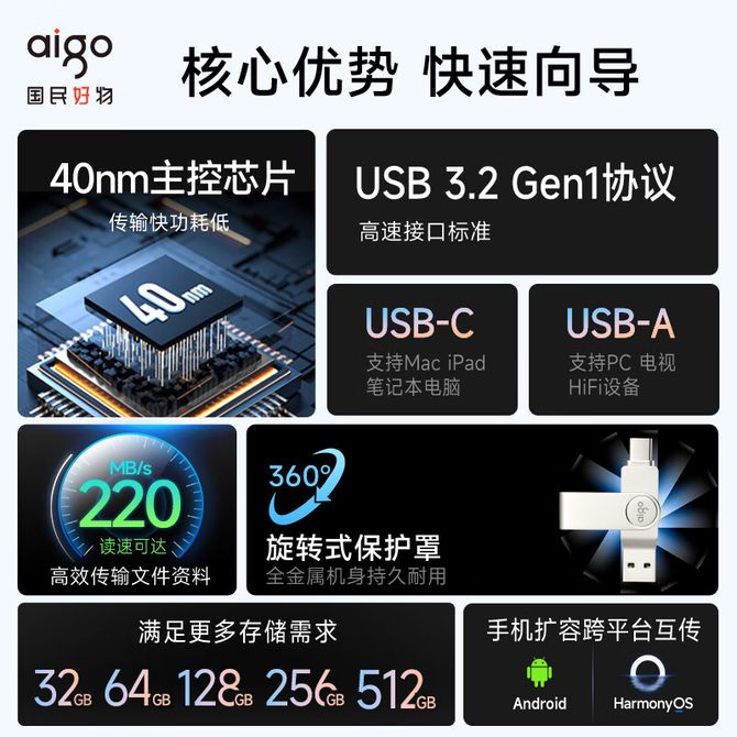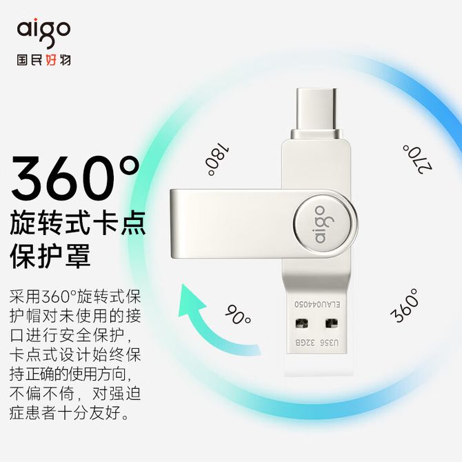 - 爱国者(aigo) USB3.2 金属旋转U盘 U330 32G/64G/128G/256G