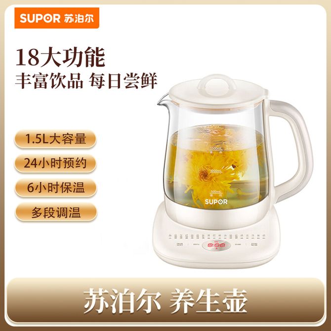 苏泊尔(SUPOR) 养生壶 1.5L 多功能煮茶器花茶壶 316L不锈钢加厚玻璃烧水壶电热水壶 24h预约6h保温 316L不锈钢,1000W大功率,24小时预约,6小时保温,18大菜单,多段调温 兑换价格 6100 里程 会员卡别 终身白金卡 白金卡 金卡 银卡 普通卡 儿童卡 服务 由 广西桂福礼供应链管理有限公司 发货并提供售后 颜色: 其他 购买数量: 件 库存件 配送地址: 立即购买 加入购物车 成功添加到购物车 关闭 购物车共有 种商品 总金额为: 组合销售 产品介绍 产品规格 售后服务 产品咨询 发现好货 九阳/Joyoung 养生壶1.5L茶具电茶壶煮茶壶花茶壶玻璃煮茶器煎药壶中药锅药膳电水壶烧水壶 3900 里程 九阳/Joyoung 养生壶迷你玻璃花茶壶煮茶器 12大功能11档温度 电水壶热水壶烧水壶 1.5L DGD1506BQ 3900 里程 美的/Midea 养生壶 1.5L家用多功能小型全自动办公室烧水壶加厚玻璃煮茶热水壶 MK-YS15P201 4200 里程 美的/Midea 养生壶 1.5L家用养生壶全自动玻璃烧水壶24h预约烧水壶12小时防干烧保护智能恒温 MK-YS15P202 3700 里程 美的/Midea 养生壶 1.5L全自动电热水壶 24h预约12小时智能恒温 14大功能11档控温 花茶壶煮茶器MK-Y12Q 3500 里程