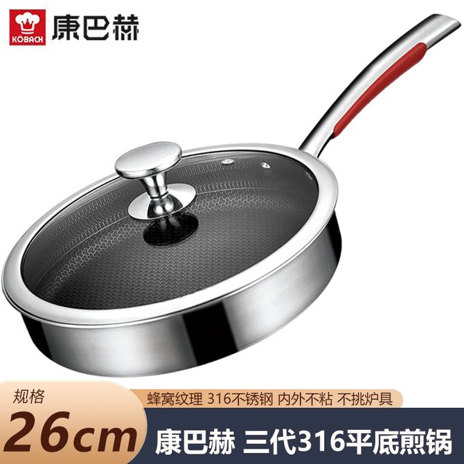 康巴赫 煎锅 26cm 三代316L不锈钢平底锅蜂窝不粘锅煎牛排煎蛋锅 电磁炉燃气通用