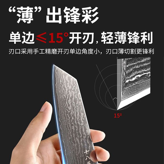 配置:水果刀、多用刀、切片刀、刀架;67层复合钢材,单边刃口≤15°开刃,切割锋利,握感舒适