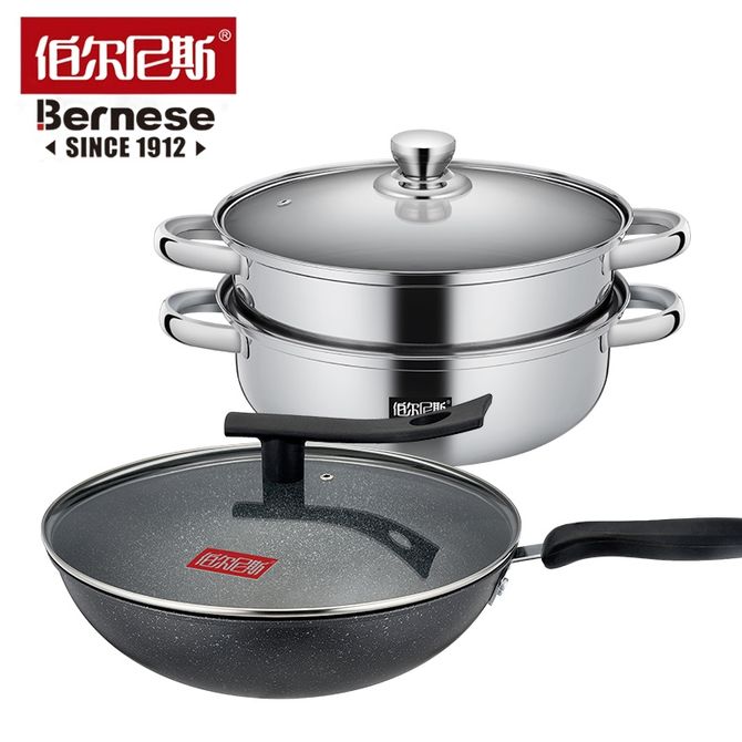 伯尔尼斯 金钢二件套 家用精铁炒锅不锈钢蒸锅锅具2件套 BENS-243-2