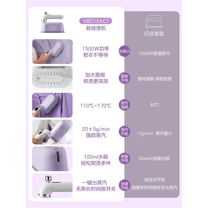 美的(Midea) 挂烫机 家用迷你便捷式 平挂熨烫衣服神器 宿舍租房小型干湿蒸汽电熨斗熨烫机 【折叠手柄】YBD15AC1 数字化显温;全面料熨烫;平挂两用;自动清洗;自动断电; 兑换价格 15200 里程 会员卡别 终身白金卡 白金卡 金卡 银卡 普通卡 儿童卡 服务 由 小枫叶专营店 发货并提供售后 颜色: 紫色 购买数量: 件 库存件 配送地址: 立即购买 加入购物车 成功添加到购物车 关闭 购物车共有 种商品 总金额为: