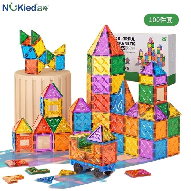 纽奇Nukied 儿童磁力片积木 7.5钻面彩窗100件套含小车*2 送收纳袋 玩具早教拼装彩窗钻面磁力贴男女孩磁铁玩具礼物