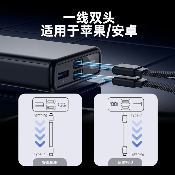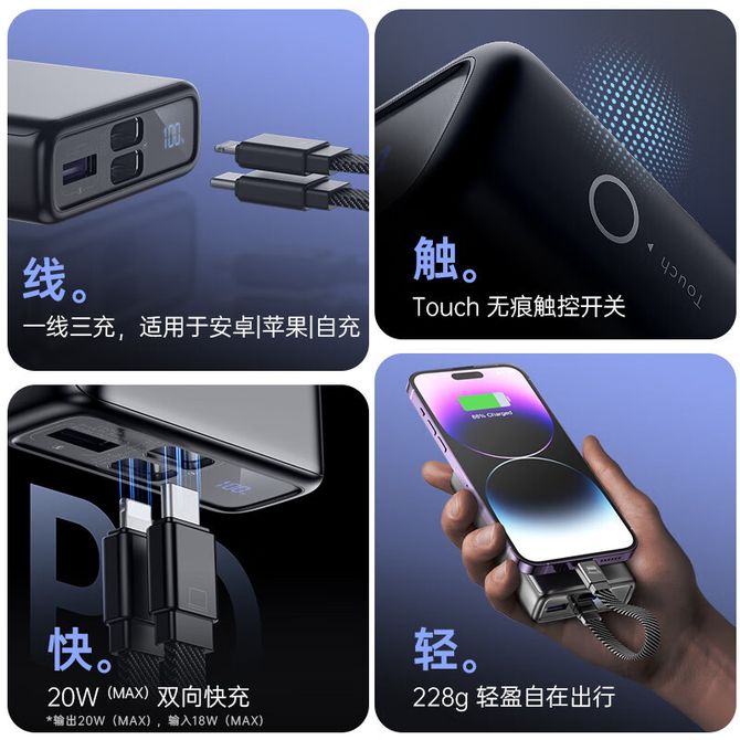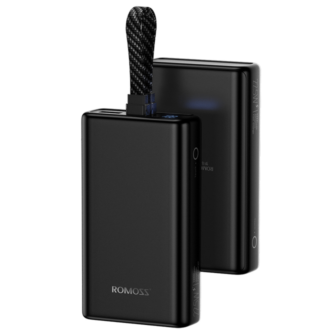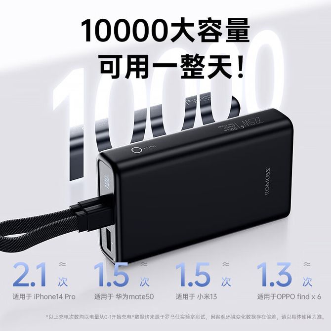 罗马仕(ROMOSS)22.5W自带线超级快充充电宝PD20W双向快充10000毫安智能显示屏便携黑色