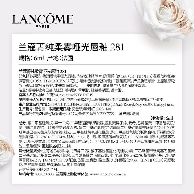 兰蔻(LANCOME)菁纯柔雾哑光唇釉、裸唇釉#281轻纱裸玫、6ml