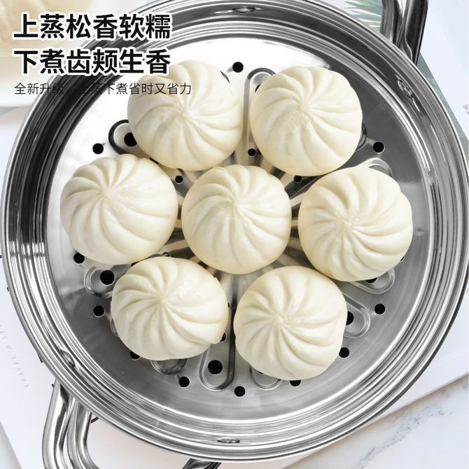 (好滋味豪华蒸锅双层BZ-302)规格:直径28CM,重量:1.9KG;优质不锈钢基材,精密抛光处理;玻璃盖带有气孔装置,锅内液体不溢出锅外;一锅多用,蒸煮炖出美味,内置不锈钢蒸屉与不锈钢蒸片,实现食物和汤水的分离,使用更方便