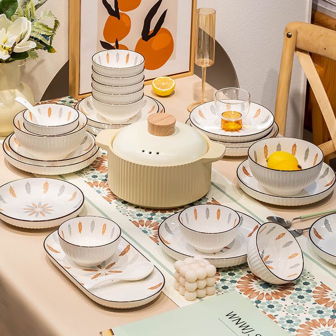 康陌(KANGMO)碗碟套装家用北欧风简约陶瓷餐具实用盘子碗筷组合【梵叶系列-8人食42件配汤碗礼盒装】