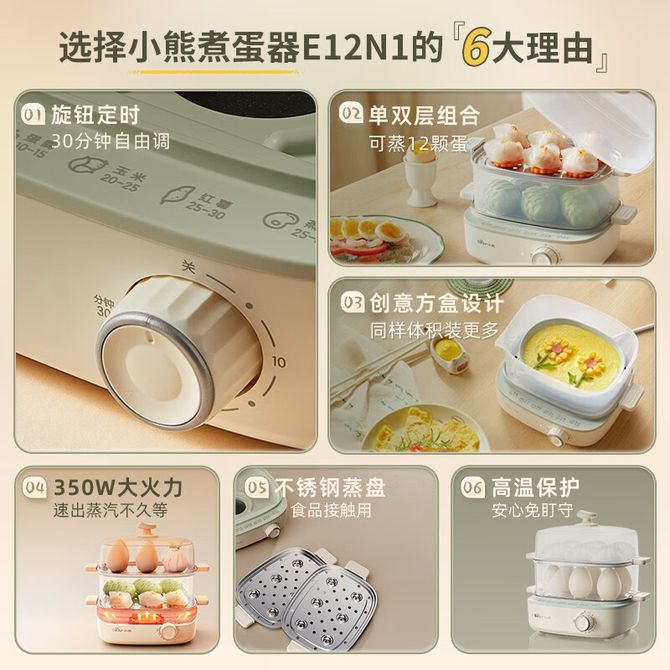 小熊/Bear 煮蛋器蒸蛋器电蒸锅煮蛋神器ZDQ-E12N1 单双层组合、可蒸12颗蛋、不锈钢蒸盘、旋钮定时 兑换价格 4400 里程 会员卡别 终身白金卡 白金卡 金卡 银卡 普通卡 儿童卡 服务 由 广西自贸区京通桂达科技发展有限公司 发货并提供售后 颜色: 米白色 购买数量: 件 库存件 配送地址: 立即购买 加入购物车 成功添加到购物车 关闭 购物车共有 种商品 总金额为: