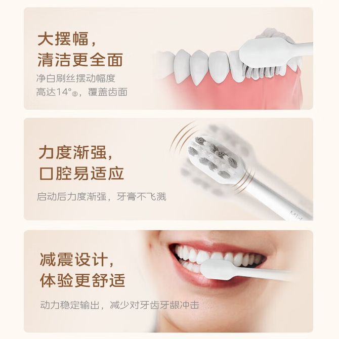 美的/Midea 电动牙刷成人学生 4种净齿模式智能换区提醒软毛刷头声波磁悬浮马达清洁美白护龈杜邦软毛智能牙刷 薄荷绿 30秒换区提醒,2分钟智能定时,磁悬浮变频声波马达,声波去牙渍! 兑换价格 6100 里程 会员卡别 终身白金卡 白金卡 金卡 银卡 普通卡 儿童卡 服务 由 北京致诚博雅贸易有限公司 发货并提供售后 颜色: 绿色 购买数量: 件 库存件 配送地址: 立即购买 加入购物车 成功添加到购物车 关闭 购物车共有 种商品 总金额为: 组合销售 产品介绍 产品规格 售后服务 产品咨询 发现好货 小米 声波电动牙刷家用男女高频振动充电式防水牙刷 T300标准版 4400 里程 京东京造 冲牙器 家用立式洗牙器洁牙器水牙线 洗牙神器 JZCY-06B 6500 里程 港德 电动便携冲牙器 水牙线 豪华款4个喷嘴 200ml大容量水箱 RD-A76-4 3400 里程 飞利浦/Philips 电动牙刷头HX9021适配HX6511/HX6730/HX6761/HX3226/ 2400 里程 小米 声波电动牙刷家用电牙刷男女士牙刷高频振动充电式防水牙刷牙齿清洁 4400 里程