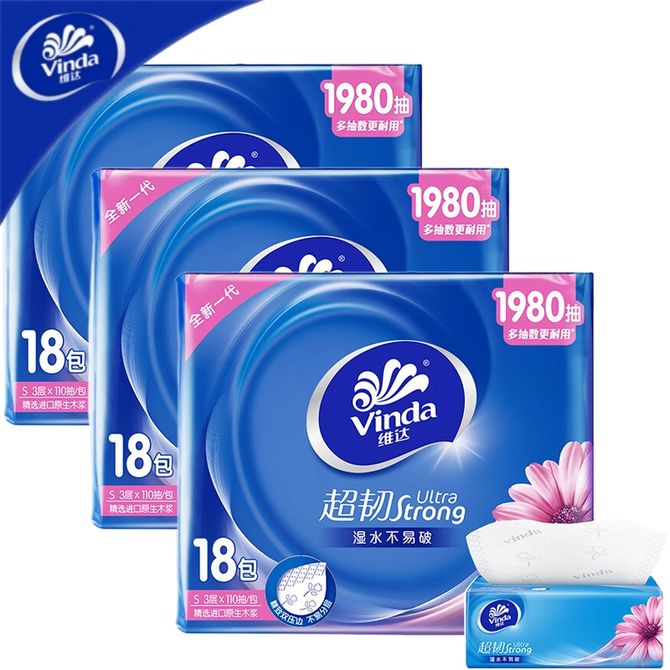 维达 超韧抽纸3层110抽18包*3提共54包 S码家庭装 自然原生木浆 湿水不易破 卫生纸纸巾餐巾纸面巾纸 维达超韧大升级,湿水不易破,进口原生木浆,自然更安心 兑换价格 8600 里程 会员卡别 终身白金卡 白金卡 金卡 银卡 普通卡 儿童卡 服务 由 翰龙雅苑 发货并提供售后 包装数量: 3提 购买数量: 件 库存件 配送地址: 立即购买 加入购物车 成功添加到购物车 关闭 购物车共有 种商品 总金额为: 组合销售 产品介绍 产品规格 售后服务 产品咨询 发现好货 维达 Vinda 卷纸 140g/卷*10卷 蓝色经典3层卫生纸 1300 里程 心相印抽纸 茶语丝享系列 量贩家庭装 3层*100抽*4包(茶香 压花) 1100 里程 心相印 经典系列 二层面巾纸 180抽*6包*1提 1100 里程 维达Vinda 超韧系列抽纸(3层*130抽*6包) 原生木浆卫生餐巾纸婴儿面巾纸 6包优惠装 1100 里程 心相印抽纸茶语丝享系列3层130抽面巾纸*6包纸巾 1300 里程