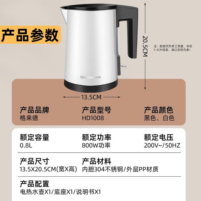 格来德/Grelide 电热水壶 0.8L小容量 烧水壶 双层防烫可视水窗 HD1008 304不锈钢 自动断电防干烧 兑换价格 6800 里程 会员卡别 终身白金卡 白金卡 金卡 银卡 普通卡 儿童卡 服务 由 生活元素 发货并提供售后 颜色: 白色 黑色 购买数量: 件 库存件 配送地址: 立即购买 加入购物车 成功添加到购物车 关闭 购物车共有 种商品 总金额为: 组合销售 产品介绍 产品规格 售后服务 产品咨询 发现好货 苏泊尔(SUPOR)电水壶 1.7L 不锈钢/YL SW-17S13A 5700 里程 志高/Chigo 电水壶烧水壶1.8L大容量电热水壶双层防烫自动断电家用烧水开水壶不锈钢 电水壶 DC-A18F 1900 里程 美的/Midea 电热水壶家用大容量烧水壶热水壶双层防烫电水壶304不锈钢内胆自动断电分离式拔盖 MK-SH15X1-102 3000 里程 小熊/Bear 电水壶家用烧水壶 不锈钢自动断电恒温热水壶保温一体电热水壶1.5L容量 3500 里程 小熊/Bear 烧水壶电水壶热水壶电热水壶开水壶304不锈钢内胆双层防烫1.5L大容量ZDH-Q15U8 3000 里程