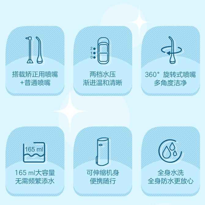 组合销售 产品介绍 产品规格 售后服务 产品咨询 发现好货 小米 声波电动牙刷家用男女高频振动充电式防水牙刷 T300标准版 4400 里程 京东京造 冲牙器 家用立式洗牙器洁牙器水牙线 洗牙神器 JZCY-06B 6500 里程 港德 电动便携冲牙器 水牙线 豪华款4个喷嘴 200ml大容量水箱 RD-A76-4 3400 里程 飞利浦/Philips 电动牙刷头HX9021适配HX6511/HX6730/HX6761/HX3226/ 2400 里程 小米 声波电动牙刷家用电牙刷男女士牙刷高频振动充电式防水牙刷牙齿清洁 4400 里程