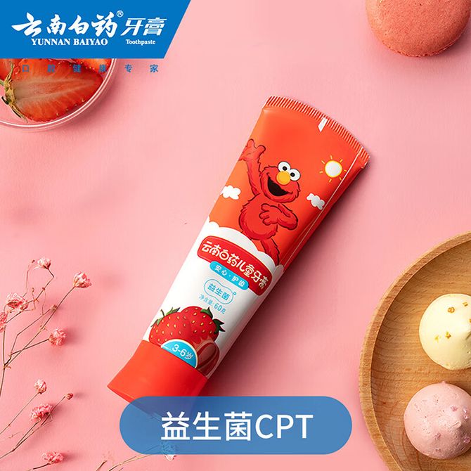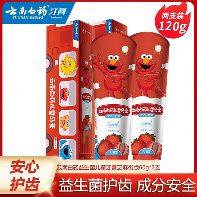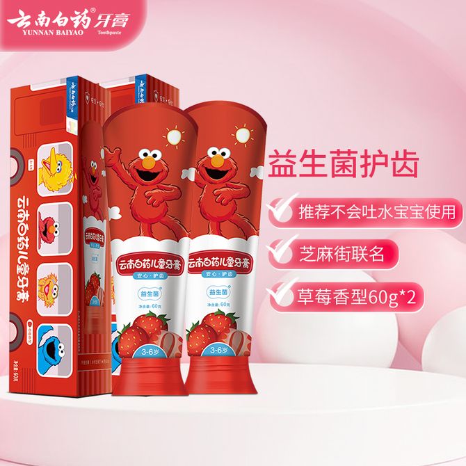 云南白药 益生菌儿童牙膏 草莓香型 60g*2支 共120g(3-6岁)芝麻街IP定制 无氟安心分龄护齿洁净口腔儿童牙膏 双支装
