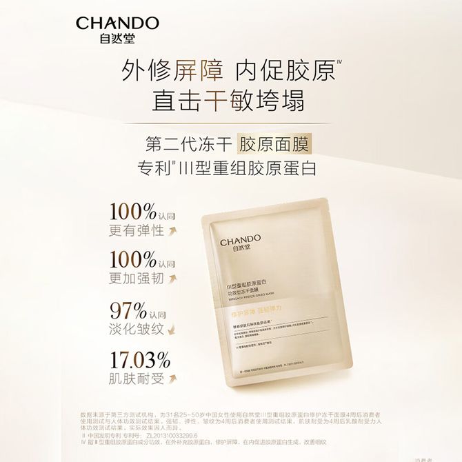自然堂/Chando III型重组胶原蛋白修护冻干面膜 0.65g*5片 修护紧致强韧肌肤 功效型冻干面膜 五片装 强韧肌肤屏障,III型重组胶原蛋白,超极酵母喜默因 兑换价格 1300 里程 会员卡别 终身白金卡 白金卡 金卡 银卡 普通卡 儿童卡 服务 由 京狮文化生活馆 发货并提供售后 面膜规格: 盒 购买数量: 件 库存件 配送地址: 立即购买 加入购物车 成功添加到购物车 关闭 购物车共有 种商品 总金额为: 组合销售 产品介绍 产品规格 售后服务 产品咨询 发现好货 自然堂/Chando 极地等渗补水修护面膜 28ml×5片 舒缓温和水润强韧 1100 里程 韩后 红石榴红茶紧致补水面膜 保湿锁水男女士可用护肤品 【补水紧致】红石榴面膜20片 2600 里程 自然堂/Chando 面膜 III型重组胶原蛋白修护冻干面膜0.65g*5片装修护抗初老 单盒 1300 里程 欧莱雅(LOREAL)复颜玻尿酸水光充盈导入淡纹膨润面膜35g*15片 8900 里程 自然堂/Chando 雪域龙胆亮润面膜26mL*5片装组合*2盒 喜马拉雅膜法 1300 里程
