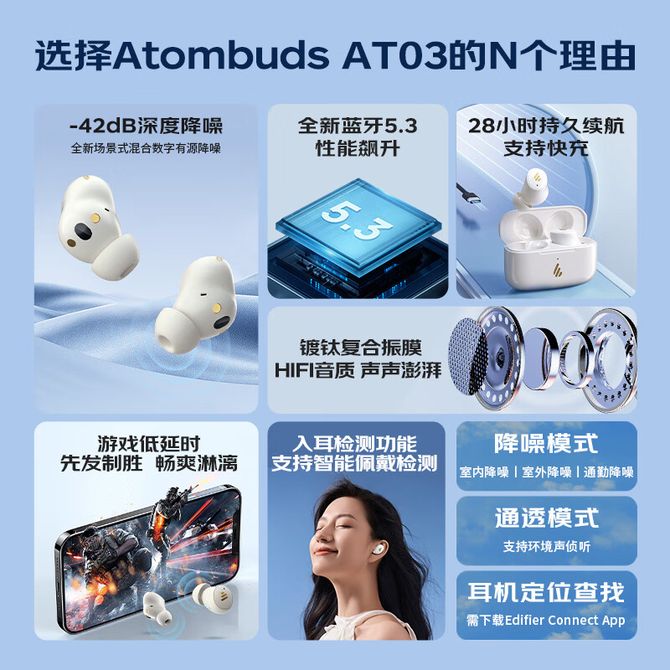 漫步者 真无线主动降噪蓝牙耳机 混合降噪入耳式游戏低延时手机音乐耳塞AtomBuds AT03粉 镀钛复合振膜HIFI音质,-42dB深度降噪,蓝牙5.3,持久续航,支持快充,IP54级防尘防水,APP自定义,入耳检测,抗菌耳套 兑换价格 12800 里程 会员卡别 终身白金卡 白金卡 金卡 银卡 普通卡 儿童卡 商品已下架 1. 请联系卖家咨询 2. 逛逛智科精品选择其他商品 组合销售 产品介绍 产品规格 售后服务 产品咨询 发现好货 飞利浦/Philips 蓝牙耳机 TAT1199-米白色 真无线半入耳式运动跑步迷你音乐降噪游戏低延迟长续航通用华为苹果 3500 里程 纽曼 耳夹式蓝牙耳机无线开放式运动防水跑步耳机LY100 5500 里程 飞利浦(PHILIPS) TAT2708 开放式真无线不入耳挂耳式耳机健身运动跑步 5500 里程 魔声 无线蓝牙耳机不入耳挂耳耳夹开放式HIFI音质舒适佩戴运动健身跑步防水长续航 AC330黑色 4400 里程 纽曼(Newmine) 开放式蓝牙耳机 耳夹式动圈HiFi音质无线耳机 蓝牙6.0长续航耳塞 5000 里程