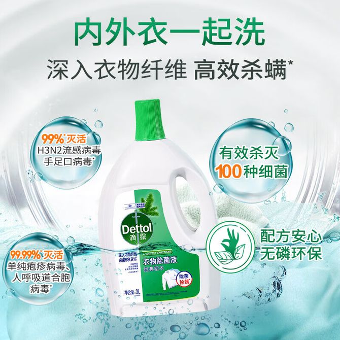 滴露/Dettol 衣物除菌液松木3L 高效除菌除螨 可配洗衣液 兑换价格 3900 里程 会员卡别 终身白金卡 白金卡 金卡 银卡 普通卡 儿童卡 服务 由 索创生活馆 发货并提供售后 净含量: 其他容量 清洁剂容量: 3L 购买数量: 件 库存件 配送地址: 立即购买 加入购物车 成功添加到购物车 关闭 购物车共有 种商品 总金额为: 组合销售 产品介绍 产品规格 售后服务 产品咨询 发现好货 蓝月亮 深层洁净洗衣液4斤 1kgx1瓶+500gx2补充装 薰衣草香 强效去渍 1500 里程 威露士/Walch La有氧洗洗衣液套装 4斤松木清香(瓶1L+袋500ml*2) 除菌除螨 1900 里程 威露士 洗衣液除菌机洗手洗家用除螨去污1L*1瓶 1500 里程 蓝月亮 亮白增艳洗衣液2斤 1kg*1瓶 1100 里程 蓝月亮 护理洗衣液去污去渍 保护衣物纤维和原色 薰衣草香 1kg*2瓶 持久留香 速溶易漂 温和配方 1500 里程
