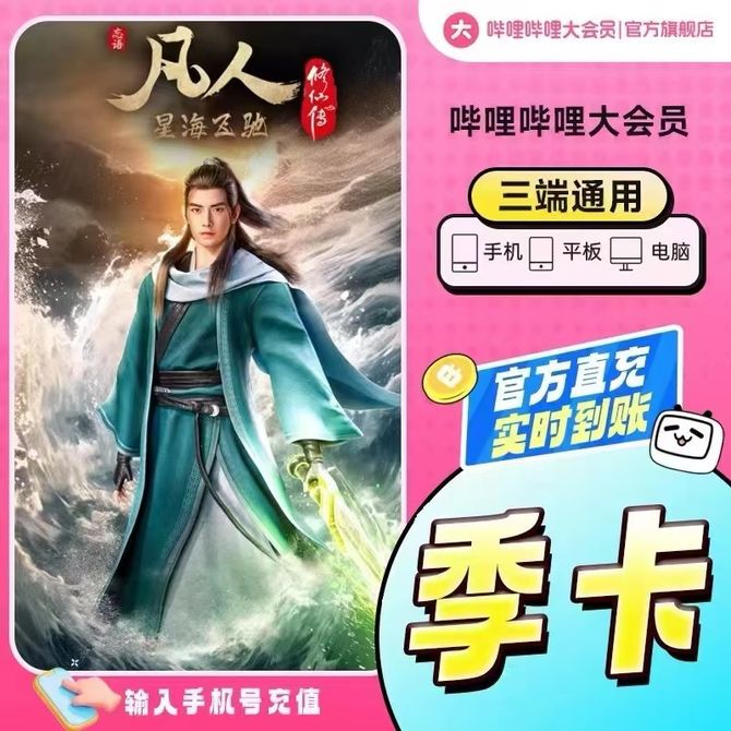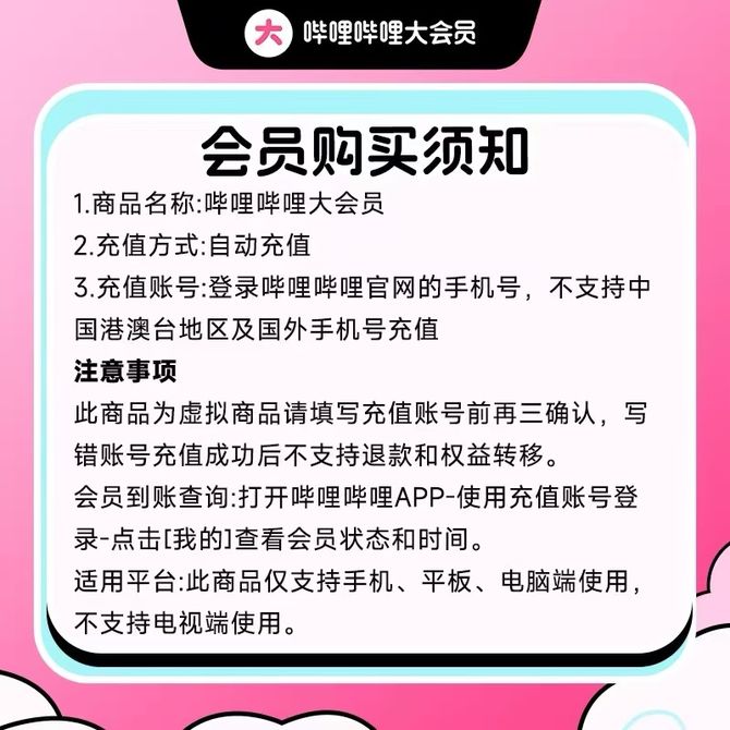 bilibili大会员季卡/官方直充到账/最晚次日到账/支持手机、平板、电脑,不支持电视端