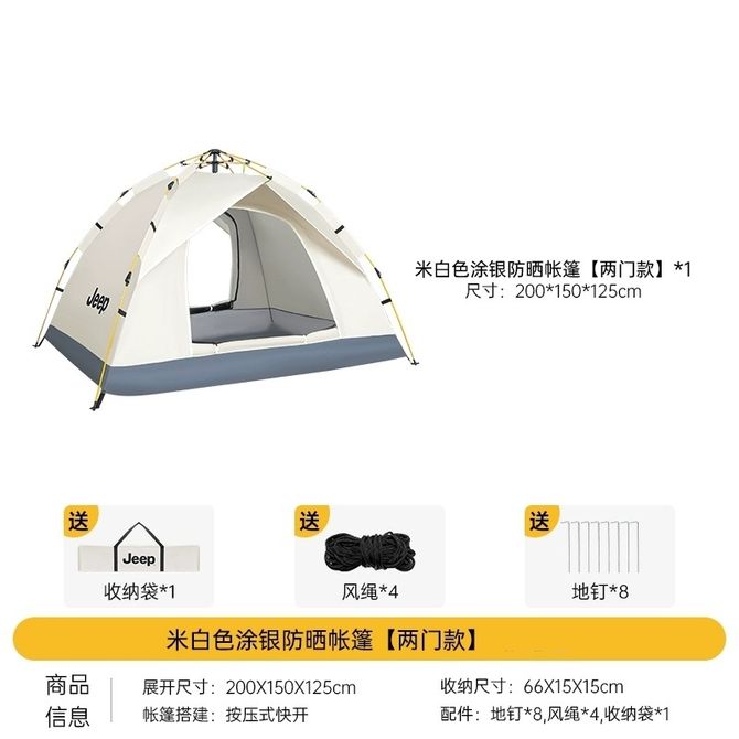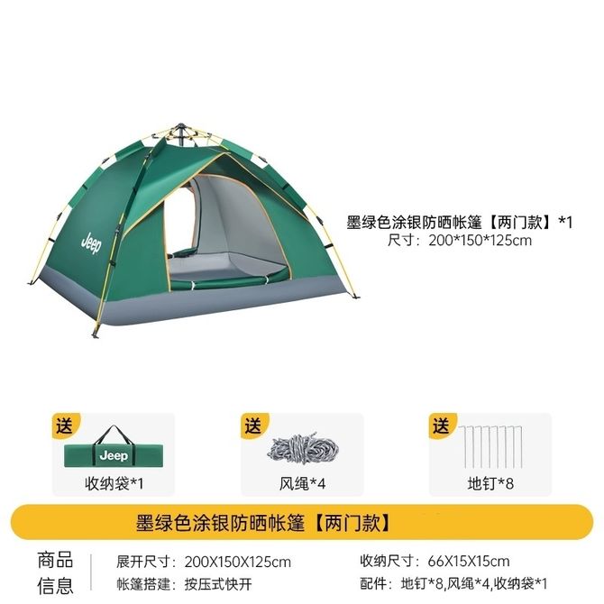 Jeep 两门四角速开自动帐篷 JP404615/JP252204(两色可选) 两色可选,涂银防晒 兑换价格 5700 里程 会员卡别 终身白金卡 白金卡 金卡 银卡 普通卡 儿童卡 服务 由 至恩户外运动专营店 发货并提供售后 颜色: 绿色 米白色 购买数量: 件 库存件 配送地址: 立即购买 加入购物车 成功添加到购物车 关闭 购物车共有 种商品 总金额为: