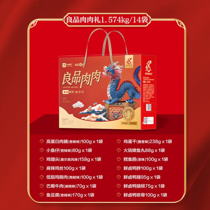配置:良品肉肉礼1574g;内配:高蛋白肉脯(香辣味)100g,小鱼仔(香辣味)80g,鸡翅尖(奥尔良风味)158g,麻辣鸡丝100g,低脂鸡胸肉(黑椒味)100g,巴蜀牛肉(麻辣味)70g,鱼豆腐(香辣味)170g,鸡蛋干(酱香味)238g,火锅嫩鱼丸88g,鳕鱼肠(原味)100g,鲜卤鸭脖100g,鲜卤鸭翅95g,鲜卤鸭翅根75g,鲜卤鸭锁骨100g