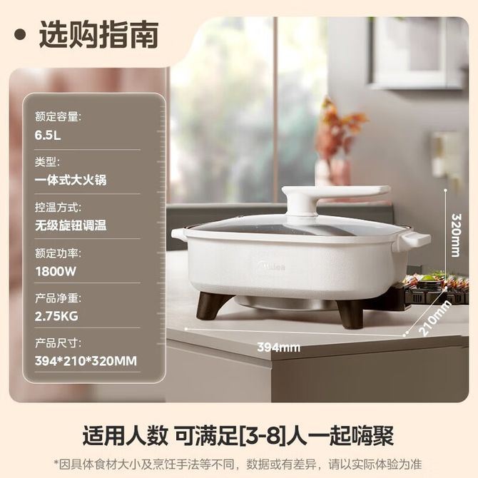 美的/Midea 电火锅 电煮锅 电炒锅 6.5L 家用多功能锅料理烤肉电热锅 多用途锅 HGE3030J04 6.5L容量;1800W功率;无级旋钮; 兑换价格 6400 里程 会员卡别 终身白金卡 白金卡 金卡 银卡 普通卡 儿童卡 服务 由 小枫叶专营店 发货并提供售后 颜色: 其他 购买数量: 件 库存件 配送地址: 立即购买 加入购物车 成功添加到购物车 关闭 购物车共有 种商品 总金额为: