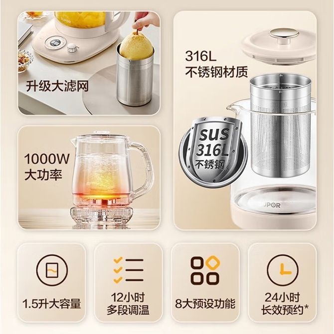 组合销售 产品介绍 产品规格 售后服务 产品咨询 发现好货 九阳/Joyoung 养生壶1.5L茶具电茶壶煮茶壶花茶壶玻璃煮茶器煎药壶中药锅药膳电水壶烧水壶 3900 里程 九阳/Joyoung 养生壶迷你玻璃花茶壶煮茶器 12大功能11档温度 电水壶热水壶烧水壶 1.5L DGD1506BQ 3900 里程 美的/Midea 养生壶 1.5L家用多功能小型全自动办公室烧水壶加厚玻璃煮茶热水壶 MK-YS15P201 4200 里程 美的/Midea 养生壶 1.5L家用养生壶全自动玻璃烧水壶24h预约烧水壶12小时防干烧保护智能恒温 MK-YS15P202 3700 里程 美的/Midea 养生壶 1.5L全自动电热水壶 24h预约12小时智能恒温 14大功能11档控温 花茶壶煮茶器MK-Y12Q 3500 里程