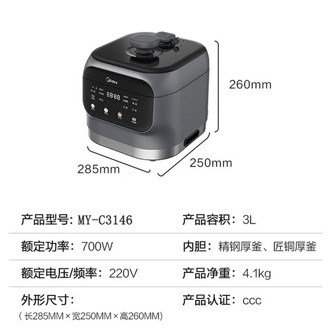 美的/Midea 电压力锅家用智能3L双胆0涂层不锈钢多功能高压锅MY-C3146 高品质+高颜值内外兼修 兑换价格 26100 里程 会员卡别 终身白金卡 白金卡 金卡 银卡 普通卡 儿童卡 服务 由 普芳家电 发货并提供售后 颜色: 其他 购买数量: 件 库存件 配送地址: 立即购买 加入购物车 成功添加到购物车 关闭 购物车共有 种商品 总金额为: 组合销售 产品介绍 产品规格 售后服务 产品咨询 发现好货 苏泊尔(SUPOR)电压力锅 6升大容量 智能触控 球釜双胆 开盖收汁 一键排压 SY-60YC8001Q 高压锅 16900 里程 美的/Midea 电压力锅家用5L大容量多功能高压锅双胆一键收汁智能预约不粘电高压锅电饭锅煮粥煲汤锅 一锅双胆【一键收汁入味】 YL50M1-702 10600 里程 苏泊尔(SUPOR) 5L电压力锅家用电高压锅双胆高压电饭锅煮饭智能预约 SY-50YC8186 11300 里程 美的/Midea 电压力锅 【一锅双胆】5L全自动家用智能预约 上蒸下煮 不粘双胆煲汤炖肉 YL50Q3-451 10900 里程 美的/Midea 电压力锅 高压锅家用电压力煲智能预约电饭煲大容量多功能定时预约电饭煲3-8人单胆旋钮款4L MY-E4809 8700 里程