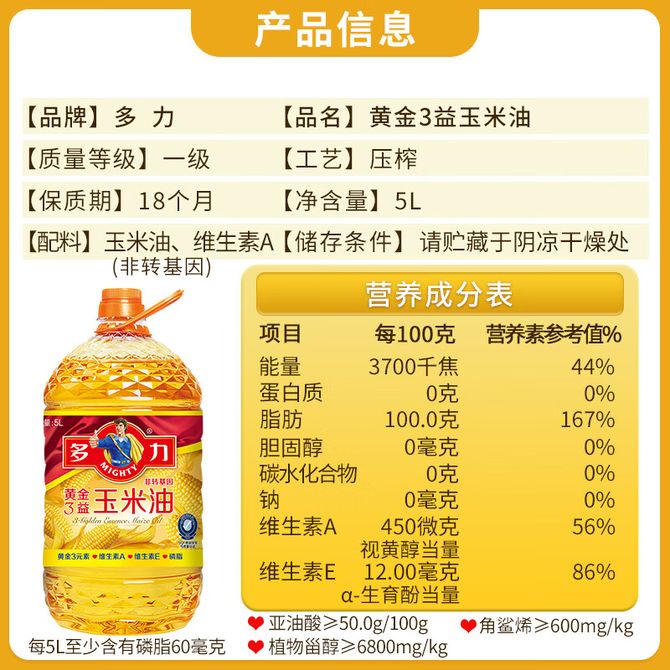 多力/Mighty 食用油黄金3益玉米油含维生素A 非转基因家用 【黄金3益玉米油 5L】 多力黄金3益玉米油5L 兑换价格 4800 里程 会员卡别 终身白金卡 白金卡 金卡 银卡 普通卡 儿童卡 服务 由 罗迪诺食品专营店 发货并提供售后 油品规格: 5L 购买数量: 件 库存件 配送地址: 立即购买 加入购物车 成功添加到购物车 关闭 购物车共有 种商品 总金额为: 组合销售 产品介绍 产品规格 售后服务 产品咨询 发现好货 长寿花 金胚玉米油食用油非转基因压榨一级 1.8L 2200 里程 珍佰粮菜籽油5L 5500 里程 福临门 一级大豆油900ML/瓶 优质家用食用油 1100 里程 福临门 家香味食用油 沂蒙土榨 花生仁油900ml 1600 里程 金龙鱼 浓香花生油5L 大桶装物理压榨一级厨房烹饪炒菜植物油粮油家庭食用油 浓香花生油食用油 5000 里程