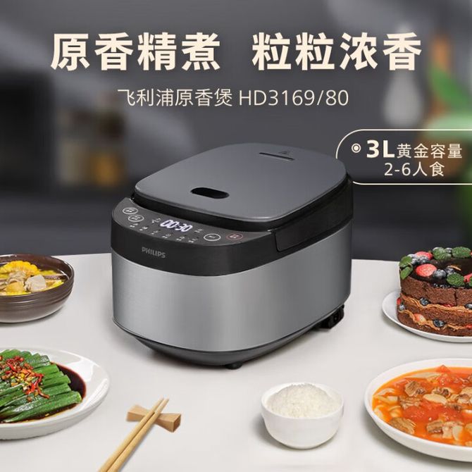 飞利浦/Philips 电饭煲HD3169/80 3L 全自动智能加热 煲汤不粘 24小时预约 上下双NTC感温均匀加热 兑换价格 39100 里程 会员卡别 终身白金卡 白金卡 金卡 银卡 普通卡 儿童卡 服务 由 存悦商贸 发货并提供售后 颜色: 黑色 购买数量: 件 库存件 配送地址: 立即购买 加入购物车 成功添加到购物车 关闭 购物车共有 种商品 总金额为: 组合销售 产品介绍 产品规格 售后服务 产品咨询 发现好货 苏泊尔(SUPOR) 电饭煲电饭锅4L大容量 不粘内胆4-6个人前置大屏面板24小时预约上蒸下煮多功能家用智能SF40FC0063 7700 里程 美菱/MELNG 电饭煲3L触控式预约定时MF-LC3005 4400 里程 美的(Midea) 电饭煲 家用3L智能预约多功能电饭锅小型1-4人煮饭锅智能 白色 MB-FB30M161 7800 里程 康佳/Konka 迷你电饭煲小电饭锅2L容量智能温控12小时预约煮饭煮粥锅 4800 里程 美的/Midea 电饭煲电饭锅3-4个人家用4L大容量聚能釜金属机身大火力米饭锅【升级焖香阀】RE417 8700 里程