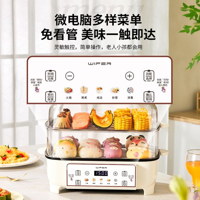WIFER 电蒸锅多功能电煮锅家用三层多层大容量蒸笼蒸箱蒸汽锅蒸锅三层款不锈钢蒸盘 【二蒸一煮】 WIFER电蒸锅三层款二蒸一煮 兑换价格 6300 里程 会员卡别 终身白金卡 白金卡 金卡 银卡 普通卡 儿童卡 服务 由 赛丹孚小家电专营店 发货并提供售后 颜色: 白色 绿色 购买数量: 件 库存件 配送地址: 立即购买 加入购物车 成功添加到购物车 关闭 购物车共有 种商品 总金额为: 组合销售 产品介绍 产品规格 售后服务 产品咨询 发现好货 苏泊尔(SUPOR)空气炸锅 家用多功能4.2L大容量 烤箱薯条机 无油烟电炸锅 大功率 无油低脂煎炸锅KJ42D811 7800 里程 美的/Midea 空气炸锅 家用5升可视炸锅金属内腔体微蒸汽多功能智能双旋控温电炸锅 KZE5089 10900 里程 奥克斯/AUX 空气炸锅5L电炸锅多功能大容量无油电炸锅空气炸锅机械款 4.5L 机械款 AUX-3002M 复古绿 6500 里程 奥克斯 电火锅 电炒锅 电煮锅 火锅锅 电锅一体锅 家用多功能料理烤肉电热锅 多用途锅大容量 无笼款 5L 4800 里程 苏泊尔(SUPOR)多功能锅料理锅电火锅多用途电煮锅不粘电热锅家用电炒锅方形烤盘煎烤锅JD3424D08-150 YL 13000 里程