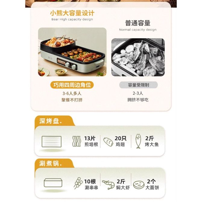小熊/Bear 电烧烤炉多功能料理锅电火锅无烟电烤炉烤肉机烤涮一体锅烧烤机E20V1 猛火速热,左烤右涮 兑换价格 8700 里程 会员卡别 终身白金卡 白金卡 金卡 银卡 普通卡 儿童卡 服务 由 北京掌一智科技有限公司 发货并提供售后 颜色: 其他 购买数量: 件 库存件 配送地址: 立即购买 加入购物车 成功添加到购物车 关闭 购物车共有 种商品 总金额为: 组合销售 产品介绍 产品规格 售后服务 产品咨询 发现好货 苏泊尔(SUPOR)电饼铛家用 双面加热煎饼铛煎烤机三明治机烙饼锅早餐机25mm加深烤盘火力可调JD31A847A 6500 里程 苏泊尔(SUPOR) 电饼铛 自动煎烤机 电火锅多功能 加大加深60mm双加热烙饼 锅面煎饼电饼档 两档火力 JT30A818 5700 里程 苏泊尔(SUPOR)电饼铛家用双面加热电饼档煎烤机烙饼机双面悬浮加热早餐机三明治机JJ30A648-Q 5700 里程 美的(Midea)电饼铛家用智能双面加热煎烤机烙饼机蛋饼机薄饼机煎饼烙饼锅JHN30F 4800 里程 奥克斯 电饼铛家庭用新款双面加热加大尺寸加深烤盘烙饼专用锅自动控温断电煎饼锅早餐机 5200 里程