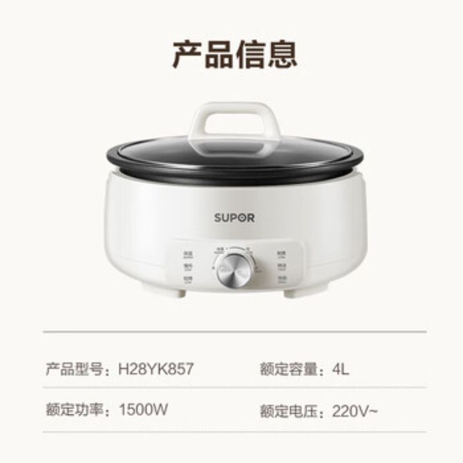 苏泊尔(SUPOR) 多功能锅 H28YK857 电火锅专用锅不粘锅 一体插电多功能电煮锅 一锅多用煎炒一体电热锅 猛火速热 电火锅专用锅不粘锅 一体插电多功能电煮锅 一锅多用煎炒一体电热锅 猛火速热 兑换价格 9000 里程 会员卡别 终身白金卡 白金卡 金卡 银卡 普通卡 儿童卡 服务 由 纳华优选 发货并提供售后 颜色: 白色 购买数量: 件 库存件 配送地址: 立即购买 加入购物车 成功添加到购物车 关闭 购物车共有 种商品 总金额为: 组合销售 产品介绍 产品规格 售后服务 产品咨询 发现好货 美的/Midea 空气炸锅 家用5升可视炸锅金属内腔体微蒸汽多功能智能双旋控温电炸锅 KZE5089 10900 里程 奥克斯/AUX 空气炸锅5L电炸锅多功能大容量无油电炸锅空气炸锅机械款 4.5L 机械款 AUX-3002M 复古绿 6500 里程 奥克斯 电火锅 电炒锅 电煮锅 火锅锅 电锅一体锅 家用多功能料理烤肉电热锅 多用途锅大容量 无笼款 5L 4800 里程 苏泊尔(SUPOR)多功能锅料理锅电火锅多用途电煮锅不粘电热锅家用电炒锅方形烤盘煎烤锅JD3424D08-150 YL 13000 里程 苏泊尔(SUPOR)多用途锅电火锅QC系列家用5.5L电蒸锅煎烤机多功能网红锅JD3424D808 13400 里程