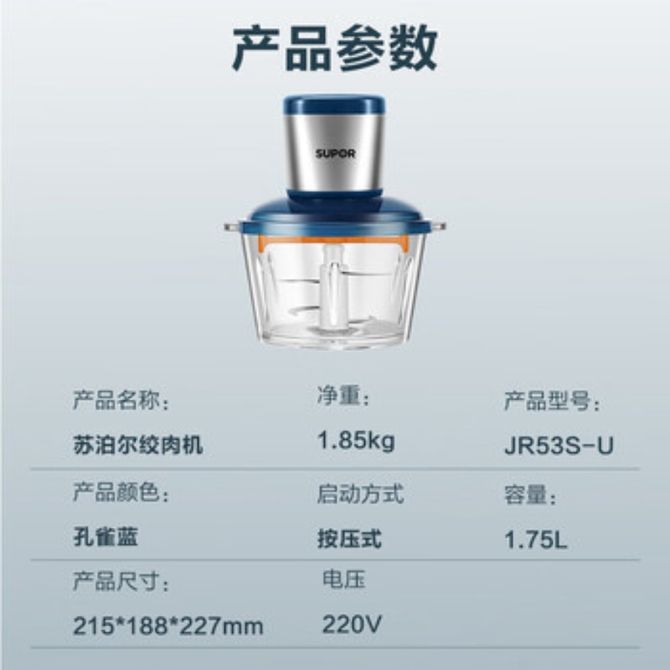 苏泊尔(SUPOR) 绞肉机JR53-U家用辅食机 绞馅机 电动多功能料理机婴儿打泥机碎肉切菜搅拌机 绞馅机 电动多功能料理机婴儿打泥机碎肉切菜搅拌机 兑换价格 7400 里程 会员卡别 终身白金卡 白金卡 金卡 银卡 普通卡 儿童卡 服务 由 纳华优选 发货并提供售后 颜色: 蓝色 购买数量: 件 库存件 配送地址: 立即购买 加入购物车 成功添加到购物车 关闭 购物车共有 种商品 总金额为: