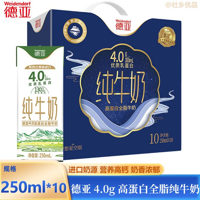 德亚/Weidendorf 4.0高蛋白全脂牛奶250mlx10礼盒(梦想星空版)新西兰进口优选黄金奶源 天然优质牧场,新西兰黄金奶源 兑换价格 3000 里程 会员卡别 终身白金卡 白金卡 金卡 银卡 普通卡 儿童卡 服务 由 壮乡优品生活馆 发货并提供售后 规格: 礼盒 购买数量: 件 库存件 配送地址: 立即购买 加入购物车 成功添加到购物车 关闭 购物车共有 种商品 总金额为: 组合销售 产品介绍 产品规格 售后服务 产品咨询 发现好货 蒙牛 特仑苏纯牛奶苗条装250ml×12盒 2900 里程 三元 经典小方白全脂纯牛奶250ml*24盒牛奶 整箱 3400 里程 伊利金典纯牛奶250ml*12盒整箱 2200 里程 伊利 金典纯牛奶整箱 250ml*12盒 3.6g乳蛋白 原生高钙 礼盒装 1800 里程 特仑苏 新日期纯牛奶250ml*12盒 3.6g乳蛋白 礼盒装 京东/顺丰发货 2400 里程