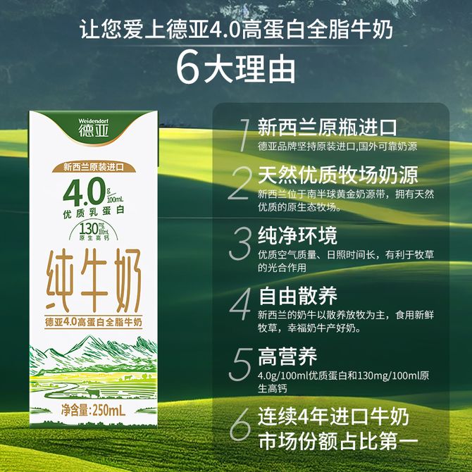 德亚/Weidendorf 4.0高蛋白牛奶甄选全球优质奶源250ML*10礼盒 配置: 4.0高蛋白牛奶礼盒250ML*10盒;口感香浓细腻 兑换价格 2600 里程 会员卡别 终身白金卡 白金卡 金卡 银卡 普通卡 儿童卡 服务 由 壮乡优品生活馆 发货并提供售后 规格: 礼盒 购买数量: 件 库存件 配送地址: 立即购买 加入购物车 成功添加到购物车 关闭 购物车共有 种商品 总金额为: 组合销售 产品介绍 产品规格 售后服务 产品咨询 发现好货 蒙牛 特仑苏纯牛奶苗条装250ml×12盒 2900 里程 三元 经典小方白全脂纯牛奶250ml*24盒牛奶 整箱 3400 里程 伊利金典纯牛奶250ml*12盒整箱 2200 里程 伊利 金典纯牛奶整箱 250ml*12盒 3.6g乳蛋白 原生高钙 礼盒装 1800 里程 特仑苏 新日期纯牛奶250ml*12盒 3.6g乳蛋白 礼盒装 京东/顺丰发货 2400 里程