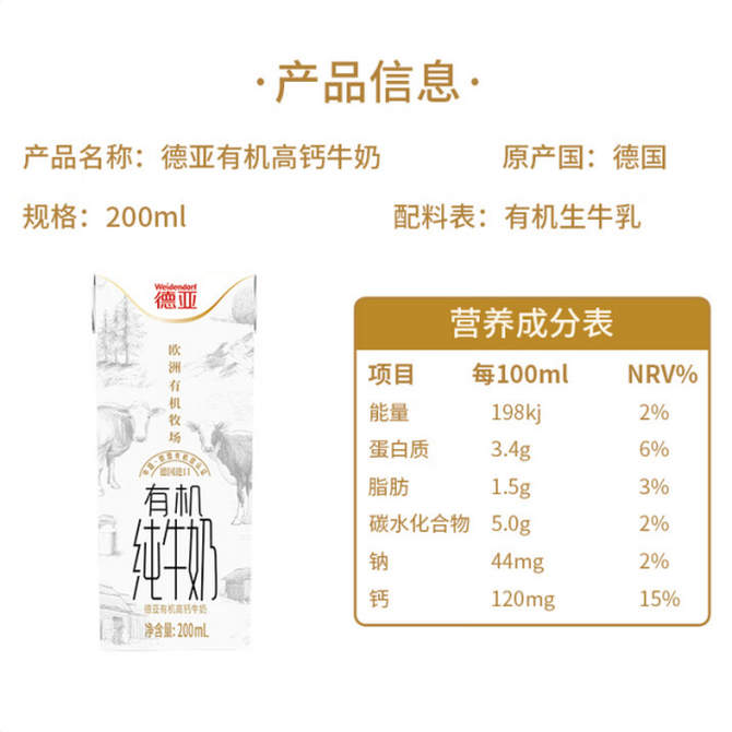 德亚 (Weidendorf)德国进口【有机】高钙纯牛奶200ml*10盒高端礼盒 规格;200ml*10盒;新旧包装随机发货 兑换价格 2400 里程 会员卡别 终身白金卡 白金卡 金卡 银卡 普通卡 儿童卡 服务 由 一间食品馆 发货并提供售后 规格: 礼盒 购买数量: 件 库存件 配送地址: 立即购买 加入购物车 成功添加到购物车 关闭 购物车共有 种商品 总金额为: 组合销售 产品介绍 产品规格 售后服务 产品咨询 发现好货 蒙牛 特仑苏纯牛奶苗条装250ml×12盒 2900 里程 三元 经典小方白全脂纯牛奶250ml*24盒牛奶 整箱 3400 里程 伊利金典纯牛奶250ml*12盒整箱 2200 里程 伊利 金典纯牛奶整箱 250ml*12盒 3.6g乳蛋白 原生高钙 礼盒装 1800 里程 特仑苏 新日期纯牛奶250ml*12盒 3.6g乳蛋白 礼盒装 京东/顺丰发货 2400 里程