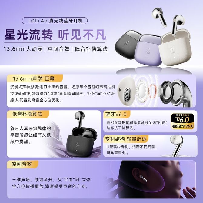 漫步者/EDIFIER 真无线空间音效蓝牙耳机 入耳式HiFi音质耳麦 AI翻译长续航手机音乐耳塞Lolli Air冰鸢紫 APP同声传译多语种翻译,13.6mm大动圈,空间音效,低音加重,HiFi音质,AI通话降噪,最新蓝牙6.0,长效续航,低延迟游戏,多EQ音效,专属APP! 兑换价格 6000 里程 会员卡别 终身白金卡 白金卡 金卡 银卡 普通卡 儿童卡 服务 由 智科精品 发货并提供售后 颜色: 紫色 购买数量: 件 库存件 配送地址: 立即购买 加入购物车 成功添加到购物车 关闭 购物车共有 种商品 总金额为: