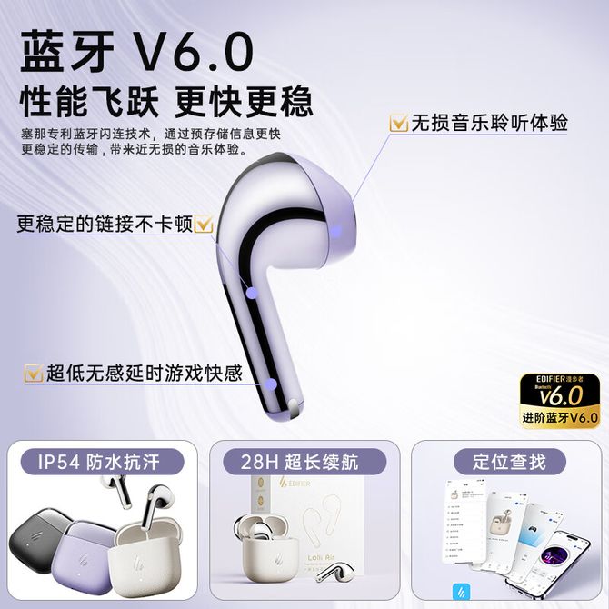 漫步者/EDIFIER 真无线空间音效蓝牙耳机 入耳式HiFi音质耳麦 AI翻译长续航手机音乐耳塞Lolli Air冰鸢紫 APP同声传译多语种翻译,13.6mm大动圈,空间音效,低音加重,HiFi音质,AI通话降噪,最新蓝牙6.0,长效续航,低延迟游戏,多EQ音效,专属APP! 兑换价格 6000 里程 会员卡别 终身白金卡 白金卡 金卡 银卡 普通卡 儿童卡 服务 由 智科精品 发货并提供售后 颜色: 紫色 购买数量: 件 库存件 配送地址: 立即购买 加入购物车 成功添加到购物车 关闭 购物车共有 种商品 总金额为: 组合销售 产品介绍 产品规格 售后服务 产品咨询 发现好货 飞利浦/Philips 蓝牙耳机骨传导概念真无线挂耳式开放式不入耳夹式运动跑步 TAT2708 5400 里程 漫步者(EDIFIER) H230P入耳式重低音手机耳机/线控可通话运动耳塞 低失真 强劲低频 2700 里程 飞利浦/Philips 蓝牙耳机 TAT1199-米白色 真无线半入耳式运动跑步迷你音乐降噪游戏低延迟长续航通用华为苹果 3500 里程 飞利浦(PHILIPS) TAT2708 开放式真无线不入耳挂耳式耳机健身运动跑步 5500 里程 纽曼 MX660线控通话耳机手机入耳式通用耳塞苹果安卓通用 1300 里程