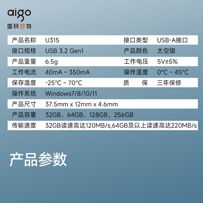 爱国者(aigo) U盘U315 【256GB】 USB3.2 Gen 1读速220MB/s 金属外壳 学生办公投标电脑车载通用 便携 大容量优盘 USB3.2 Gen 1读速220MB/s 金属外壳 学生办公投标电脑车载通用 便携 大容量优盘 兑换价格 5700 里程 会员卡别 终身白金卡 白金卡 金卡 银卡 普通卡 儿童卡 服务 由 华睿博望 发货并提供售后 存储容量: 256GB 购买数量: 件 库存件 配送地址: 立即购买 加入购物车 成功添加到购物车 关闭 购物车共有 种商品 总金额为: 组合销售 产品介绍 产品规格 售后服务 产品咨询 发现好货 雷摄 (LEISE)LS-UP1 128g64gU盘高速电脑金属外壳迷你可爱车载u盘优盘 1300-3000 里程 台电(Teclast) 乐环 轻薄全金属U盘64G 商务闪存盘/优盘 迷你小巧 抗压防水 2200 里程 爱国者(aigo) Type-C手机U盘 USB3.2高速两用 双接口U盘 U350-32G/64G/128G/256G 1900-7100 里程 爱国者(aigo) USB2.0金属防水u盘 车载办公U盘 16G/32G/64G 1100-1500 里程 台电/Teclast 64GB 莫比乌斯环USB3.2迷你金属U盘 便携优盘闪存盘 1700 里程