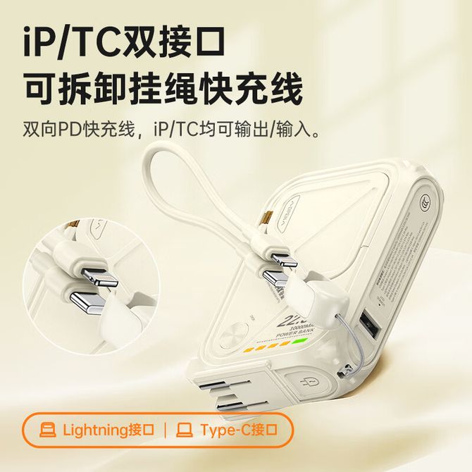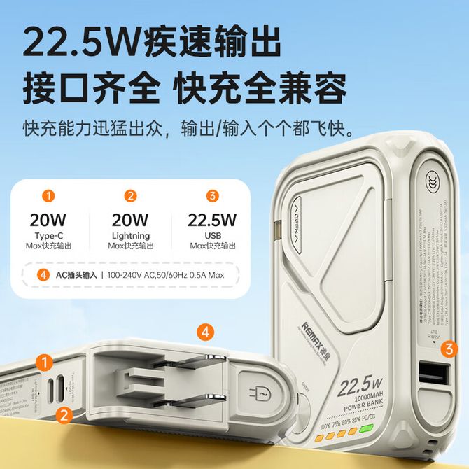 自带AC插头,既是充电宝又是充电器;自带线支架+磁吸无线充可满足手机横屏模式边冲边用