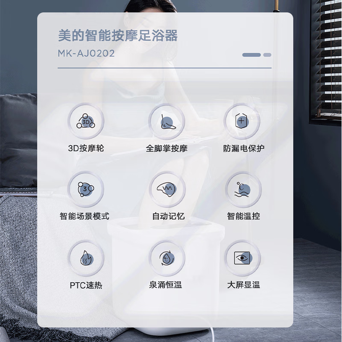 美的/Midea 足浴盆 家用全自动按摩泡脚桶电动洗脚盆高深桶智能恒温加热防漏电保护送长辈礼物 MK-AJ0202 3D按摩轮;全脚掌按摩;防漏电保护;自动记忆;智能温控;大屏显温; 兑换价格 17400 里程 会员卡别 终身白金卡 白金卡 金卡 银卡 普通卡 儿童卡 服务 由 泓久电器专营店 发货并提供售后 颜色: 白色 购买数量: 件 库存件 配送地址: 立即购买 加入购物车 成功添加到购物车 关闭 购物车共有 种商品 总金额为: