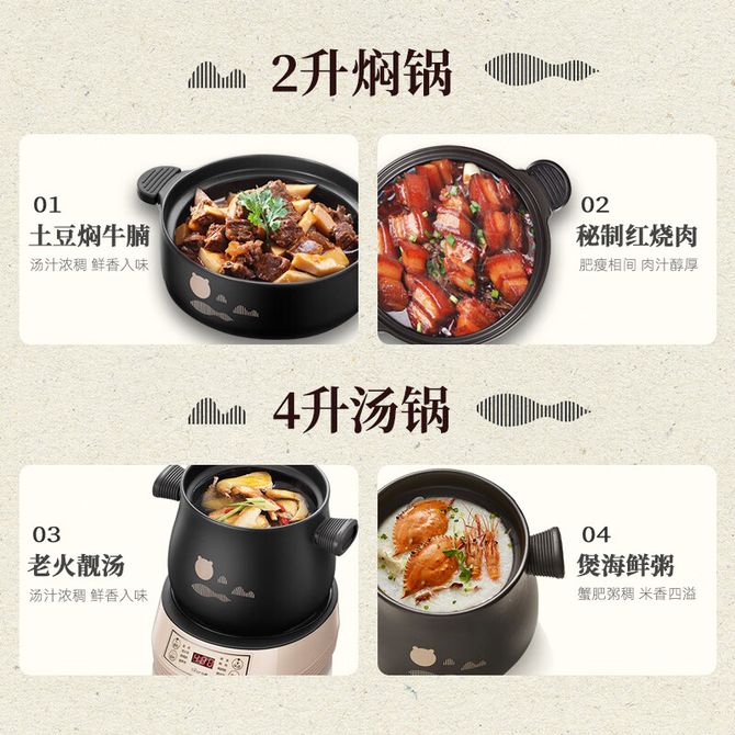 小熊/Bear 电砂锅养生煮粥快速焖炖锅分体式高温陶瓷双锅(汤锅&焖锅4L+2L) 汤锅&焖锅 旋钮+按键 耐高温陶瓷 传热均匀 持续沸腾 分体式设计 两种保温方式 兑换价格 15700 里程 会员卡别 终身白金卡 白金卡 金卡 银卡 普通卡 儿童卡 服务 由 中农创家电生活馆 发货并提供售后 颜色: 其他 购买数量: 件 库存件 配送地址: 立即购买 加入购物车 成功添加到购物车 关闭 购物车共有 种商品 总金额为: 组合销售 产品介绍 产品规格 售后服务 产品咨询 发现好货 小熊/Bear 电炖锅1-2人小炖锅煮粥锅智能预约定时煲汤锅炖汤锅燕窝炖盅 4400 里程 苏泊尔(SUPOR) 电火锅家用不粘煎涮炖煮多功能4L大容量一体式大火力电煮锅不粘煎涮炖煮多功能料理锅 H40YK757 5700 里程 苏泊尔(SUPOR) 电火锅 宿舍小电锅学生寝室一体泡面小火锅 多功能锅涮肉涮菜 1.7L 【 单锅】H17YK489 3000 里程 小熊(Bear)电炖锅电炖盅煮粥神器煲汤锅炖汤锅婴儿煮粥锅熬粥燕窝炖盅DDG-E15K2 4800 里程 利仁(Liven)电炒锅电煮锅电火锅 家用多功能小电锅电炖锅宿舍泡面锅 4.5L容量 DHG-X451 5200 里程