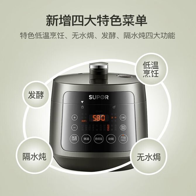 组合销售 产品介绍 产品规格 售后服务 产品咨询 发现好货 苏泊尔(SUPOR)电压力锅 6升大容量 智能触控 球釜双胆 开盖收汁 一键排压 SY-60YC8001Q 高压锅 16900 里程 美的/Midea 电压力锅家用5L大容量多功能高压锅双胆一键收汁智能预约不粘电高压锅电饭锅煮粥煲汤锅 一锅双胆【一键收汁入味】 YL50M1-702 10600 里程 苏泊尔(SUPOR) 5L电压力锅家用电高压锅双胆高压电饭锅煮饭智能预约 SY-50YC8186 11300 里程 美的/Midea 电压力锅 【一锅双胆】5L全自动家用智能预约 上蒸下煮 不粘双胆煲汤炖肉 YL50Q3-451 10900 里程 美的/Midea 电压力锅 高压锅家用电压力煲智能预约电饭煲大容量多功能定时预约电饭煲3-8人单胆旋钮款4L MY-E4809 8700 里程