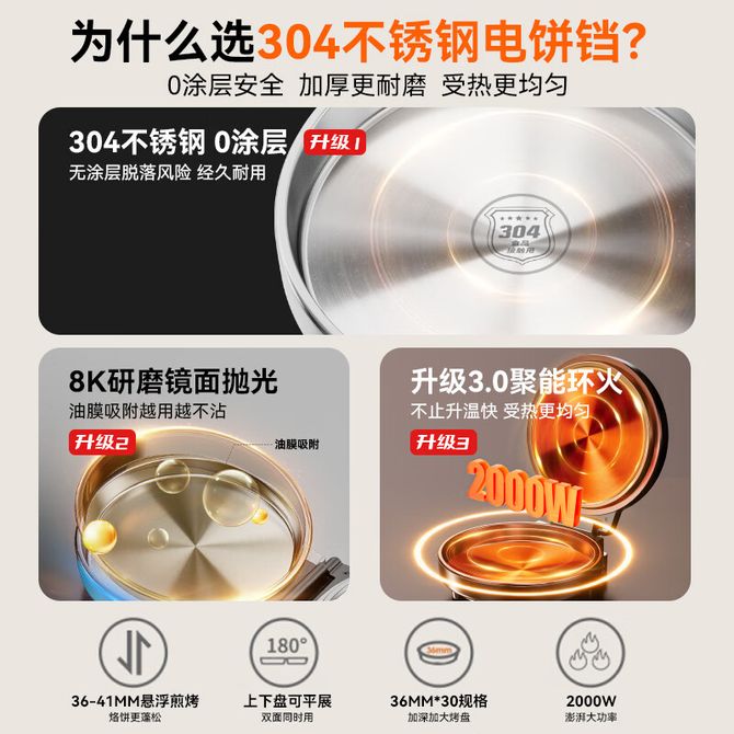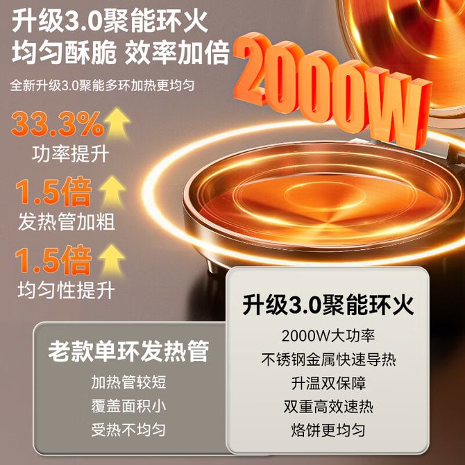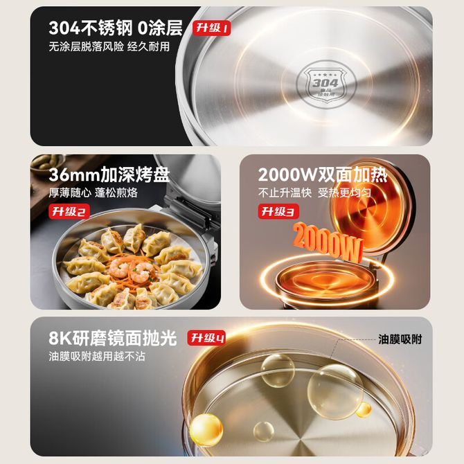 组合销售 产品介绍 产品规格 售后服务 产品咨询 发现好货 苏泊尔(SUPOR)电饼铛家用 双面加热煎饼铛煎烤机三明治机烙饼锅早餐机25mm加深烤盘火力可调JD31A847A 6500 里程 苏泊尔(SUPOR) 电饼铛 自动煎烤机 电火锅多功能 加大加深60mm双加热烙饼 锅面煎饼电饼档 两档火力 JT30A818 5700 里程 苏泊尔(SUPOR)电饼铛家用双面加热电饼档煎烤机烙饼机双面悬浮加热早餐机三明治机JJ30A648-Q 5700 里程 美的(Midea)电饼铛家用智能双面加热煎烤机烙饼机蛋饼机薄饼机煎饼烙饼锅JHN30F 4800 里程 奥克斯 电饼铛家庭用新款双面加热加大尺寸加深烤盘烙饼专用锅自动控温断电煎饼锅早餐机 5200 里程