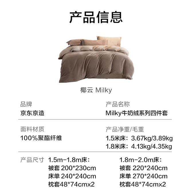 京东京造 220g牛奶绒四件套 A类秋冬加厚高克重法兰绒床单套装 椰云Milky 适用于1.5-2米床 发货规格:200*230cm和220*240cm为被套尺寸 国标A类 活性印染 加厚保暖 科技抗静电3 兑换价格 14000-15000 里程 会员卡别 终身白金卡 白金卡 金卡 银卡 普通卡 儿童卡 服务 由 上海槿沅贸易有限公司 发货并提供售后 床品套件数量: 四件套 被、单尺寸: 200*230cm 220*240cm 颜色: 其他 购买数量: 件 库存件 配送地址: 立即购买 加入购物车 成功添加到购物车 关闭 购物车共有 种商品 总金额为: 组合销售 产品介绍 产品规格 售后服务 产品咨询 发现好货 宜恋家纺 全棉四件套床上用品套件床单被套枕套礼品 爱巢 1.5-1.8米床适用 7200 里程 九洲鹿 纯棉四件套床品套件 青春气息 YJYH0017 8700 里程 南极人 亲肤纯色裸睡水洗磨毛床上用品四件套 果绿+曦月 N4XW086 5700 里程 洁丽雅 磨毛四件套加厚套件床单款小清新ins风床上用品双人被套床上用品床品四件套初夏-桔 被套200*230cm JDSJT019 4400 里程 紫韵家纺 “自由格调”时尚四件套 磨绒印花床品套件 被套床单枕套ZY-SD1151 7400 里程