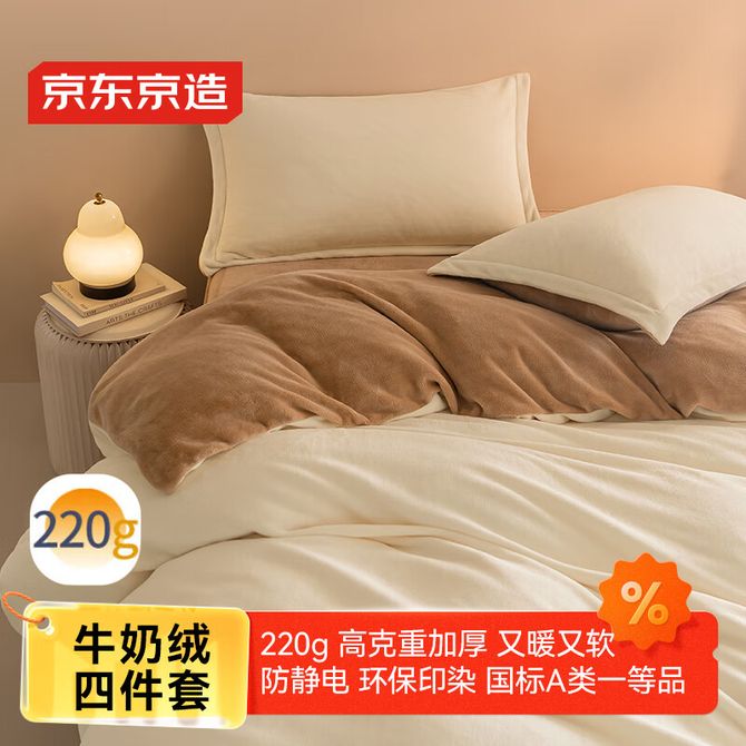京东京造 220g牛奶绒四件套 秋冬双面加厚暖绒床品套件 A类双人保暖床单枕套被套 榛果Milky 发货规格:200*230cm和220*240cm为被套尺寸 国标A类 活性印染 加厚保暖 科技抗静电 兑换价格 14000-15000 里程 会员卡别 终身白金卡 白金卡 金卡 银卡 普通卡 儿童卡 服务 由 上海槿沅贸易有限公司 发货并提供售后 床品套件数量: 四件套 被、单尺寸: 200*230cm 220*240cm 颜色: 其他 购买数量: 件 库存件 配送地址: 立即购买 加入购物车 成功添加到购物车 关闭 购物车共有 种商品 总金额为: 组合销售 产品介绍 产品规格 售后服务 产品咨询 发现好货 宜恋家纺 全棉四件套床上用品套件床单被套枕套礼品 爱巢 1.5-1.8米床适用 7200 里程 九洲鹿 纯棉四件套床品套件 青春气息 YJYH0017 8700 里程 南极人 亲肤纯色裸睡水洗磨毛床上用品四件套 果绿+曦月 N4XW086 5700 里程 洁丽雅 磨毛四件套加厚套件床单款小清新ins风床上用品双人被套床上用品床品四件套初夏-桔 被套200*230cm JDSJT019 4400 里程 紫韵家纺 “自由格调”时尚四件套 磨绒印花床品套件 被套床单枕套ZY-SD1151 7400 里程